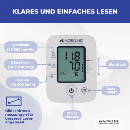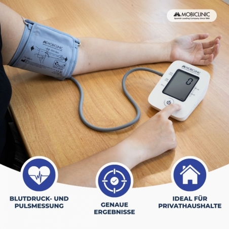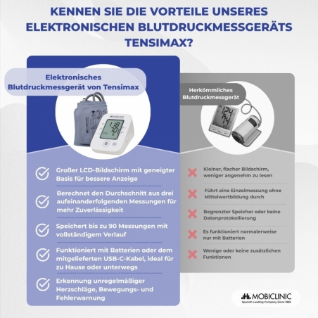 Das Tensimax-Arm-Blutdruckmessgerät bietet eine umfassende, intuitive und präzise Möglichkeit zur Blutdrucküberwachung zu Hause. Dank der zentralen Taste ist es einfach zu bedienen und für jeden Benutzer zugänglich. Der geneigte Standfuß verbessert die Sichtbarkeit und ermöglicht ein komfortables Ablesen der Ergebnisse.