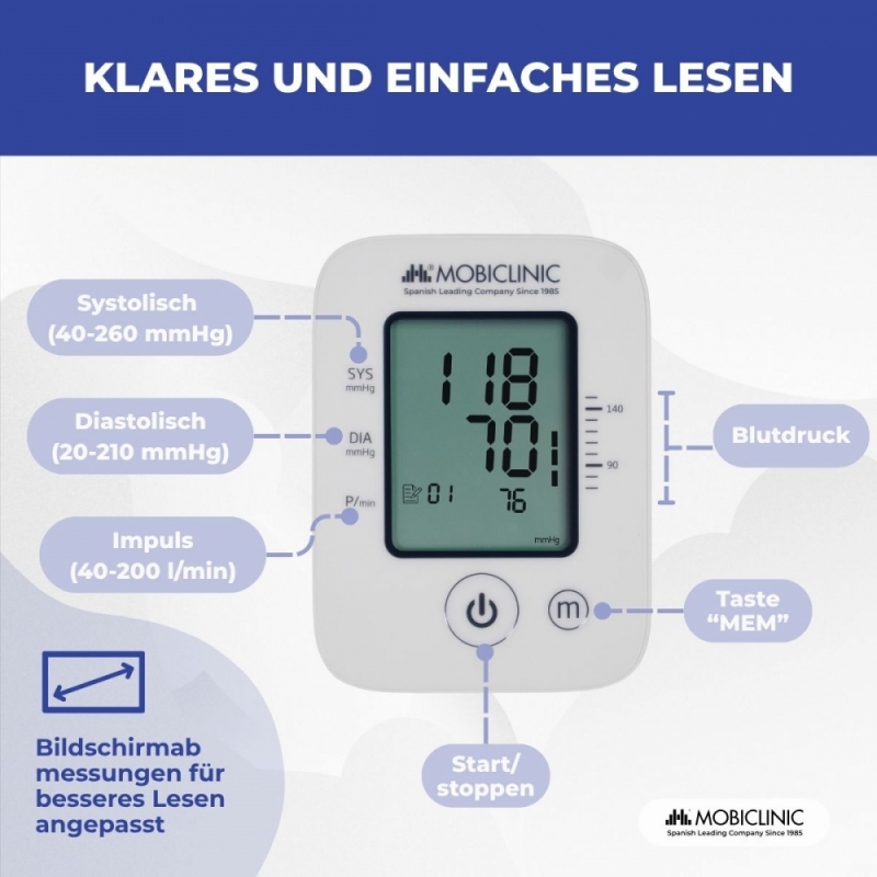 Auf dem großen LCD-Bildschirm werden folgende Informationen klar und präzise angezeigt: systolischer und diastolischer Druck, Puls, Batteriestand, Aufpump- und Entleerungsfunktion, Manschettenerkennung, Bewegungsfehler und Datenaufzeichnungssymbol. Zusätzlich zur Speicherfunktion kann der Durchschnitt dreier aufeinanderfolgender Messungen berechnet werden, um zuverlässigere Daten zu erhalten.
