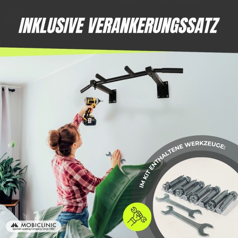 Das mitgelieferte Montageset ermöglicht die individuelle Höhenverstellung der Stange und passt sie so an unterschiedliche Bedürfnisse und Übungsarten an. Dank der kompakten und robusten Bauweise lässt sie sich problemlos an jeder Wand in Ihrem Zuhause anbringen.