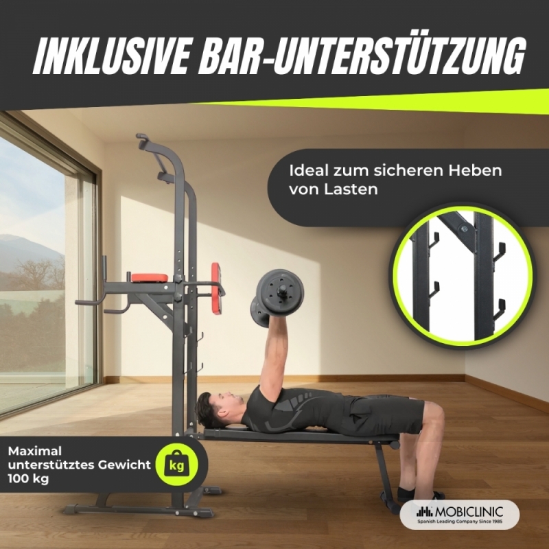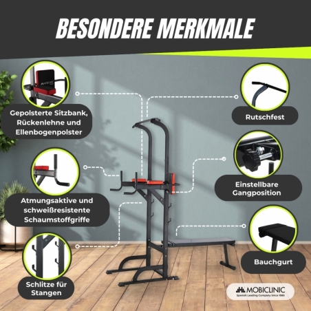 Die ergonomischen, rutschfesten Griffe ermöglichen einen bequemen Halt und vermeiden Fehlhaltungen, die die Handgelenke schädigen könnten. Darüber hinaus bietet die Rückenlehne zusätzlichen Halt bei Übungen wie Beinheben und sorgt so für ein sichereres und effizienteres Üben. Dank der zusammenklappbaren Abmessungen lässt sich diese Station leicht verstauen und transportieren und ist somit eine ideale Option für alle, die ein Heim-Fitnessstudio wünschen, ohne zu viel Platz einzunehmen.
