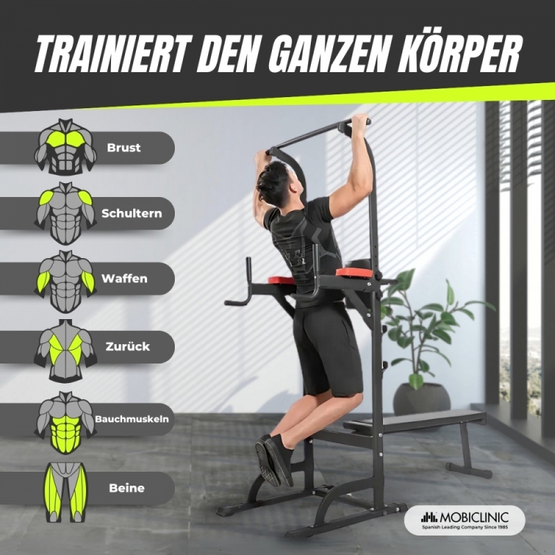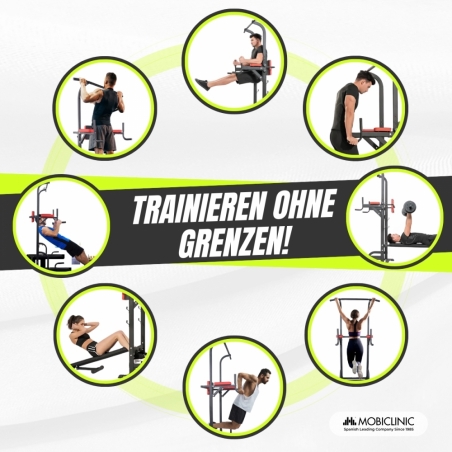 Mit diesem 9-in-1- Fitnessgerät können Sie eine Vielzahl von Übungen durchführen, darunter Beinheben, Kniebeugen, Dip-Barren, Militärdrücken, Bankdrücken, Klimmzüge, bulgarische Kniebeugen, Hantelrudern, Klimmzüge mit weitem Griff und Krafttraining . die Rückseite. Durch die 8 verschiedenen Höhen der Klimmzugstange lässt sich jede Übung individuell anpassen. Dieser vielseitige Ansatz hilft, die Kraft des Oberkörpers, die Muskelmasse und die Ausdauer zu verbessern.