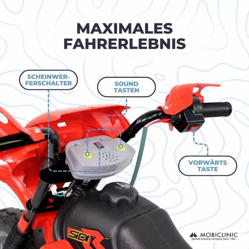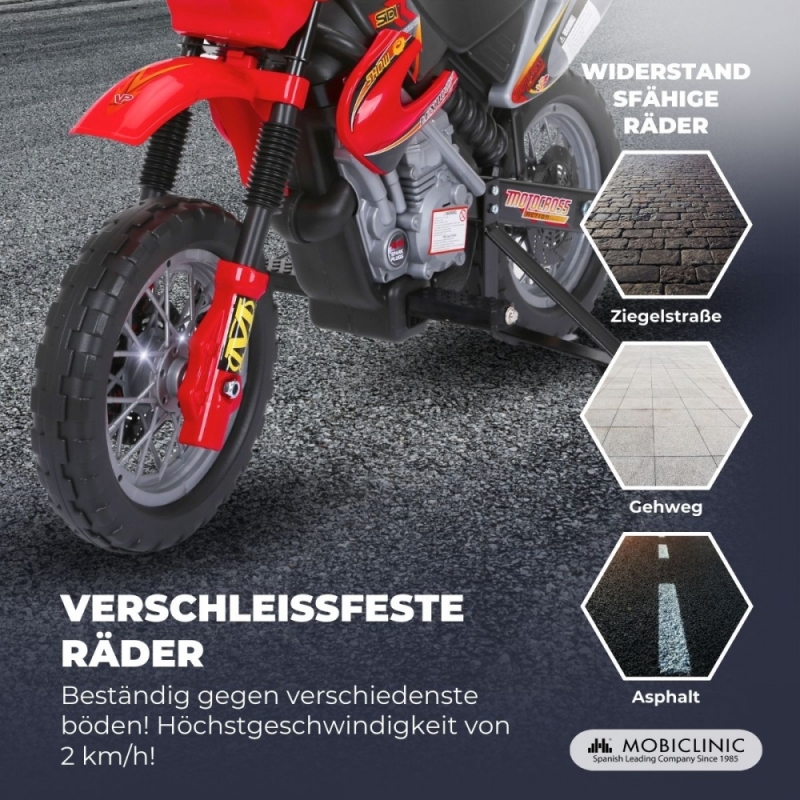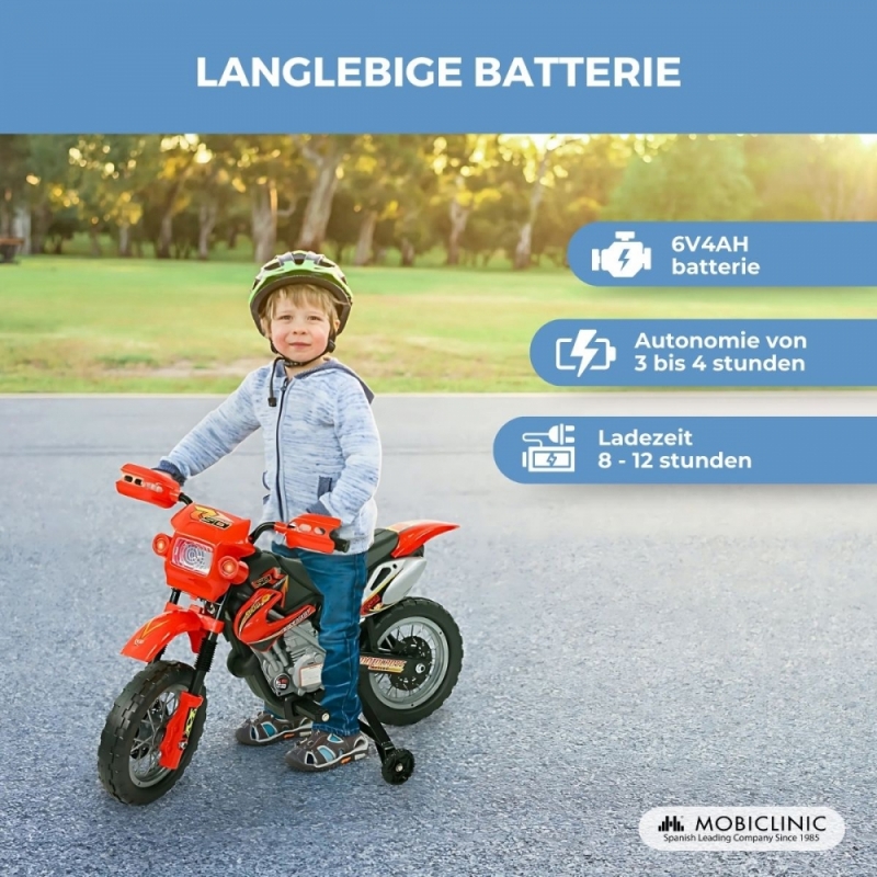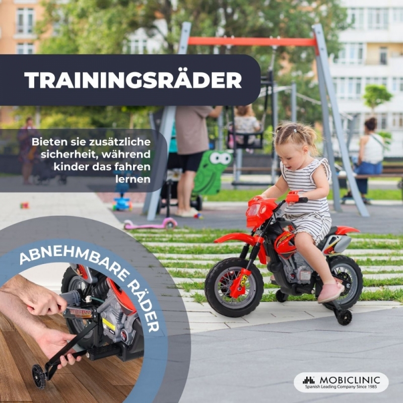 Kinder-Elektromotorrad| Soundtasten | Vorwärtstaste | Licht | Stützräder | Batterie | MobiCross | Mobiclinic