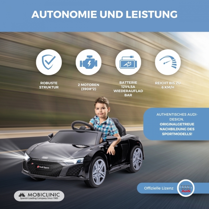 Das Elektroauto MobiSporty, lizenzierter Audi R8 Spyder, bietet ein realistisches und sicheres Fahrerlebnis für Kinder von 36 bis 72 Monaten. Dieses Fahrzeug eignet sich ideal für den Innen- und Außenbereich und ist mit einem elektrischen Pedal, einer 2,4-G-Fernbedienung, LED-Leuchten und Bluetooth-Funktionen ausgestattet.