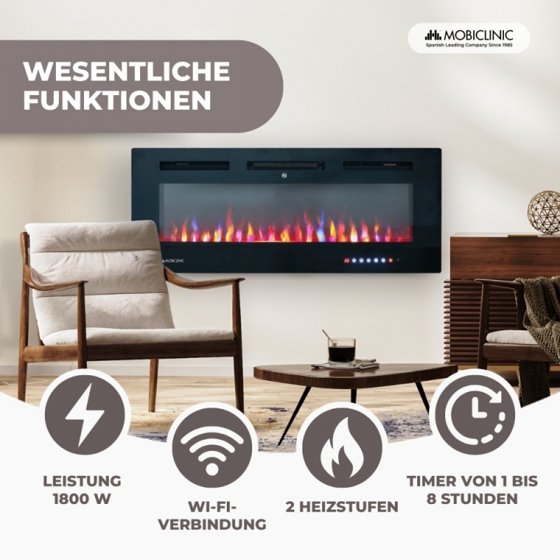 GARANTIERTE SICHERHEIT: Es verfügt über ein Schutzsystem gegen Überhitzung, dank eines internen Thermostats, der die Stromversorgung unterbricht, wenn ein ungewöhnlicher Temperaturanstieg festgestellt wird, und so Schäden und Risiken vermeidet. Es verfügt außerdem über einen einstellbaren Timer von 1 bis 8 Stunden, mit dem Sie den Betrieb für mehr Komfort programmieren können. Mit einer Leistung von 1800 W garantiert der Fury-Kamin eine effiziente und sichere Heizung.
