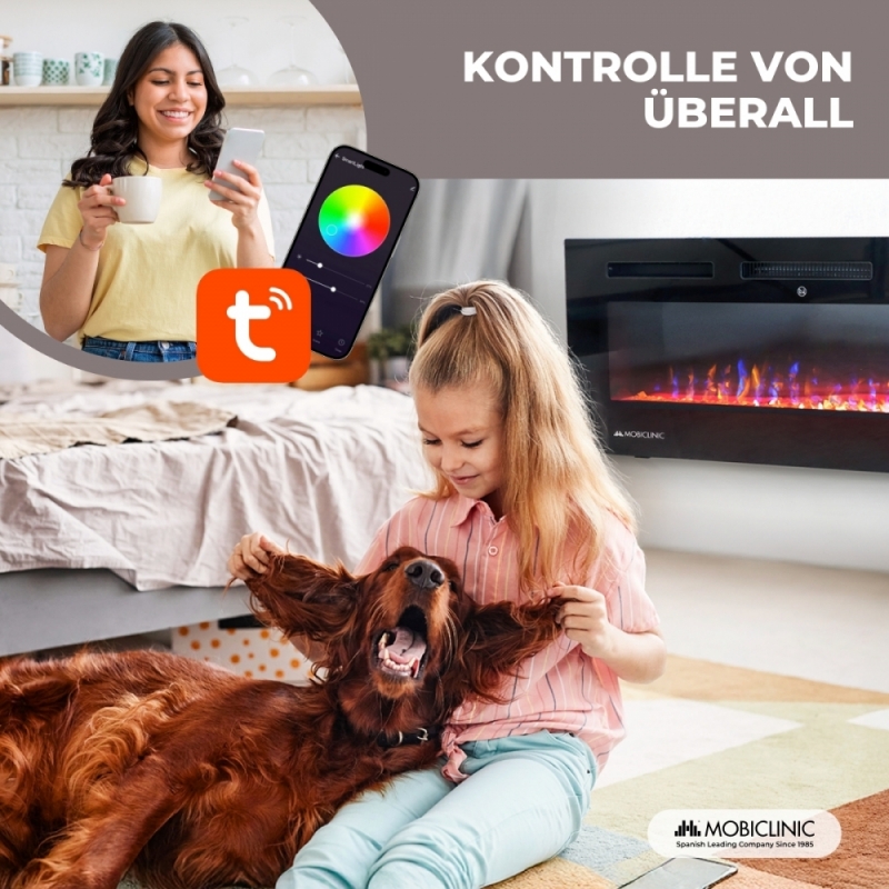 KONTROLLE IN IHRER REICHWEITE: Steuern Sie Ihren Elektrokamin auf komfortable und intuitive Weise dank der zahlreichen Optionen, die sich an Ihre Bedürfnisse anpassen. Er verfügt über eine Fernbedienung , mit der Sie sämtliche Änderungen mühelos vornehmen können, und ein integriertes Touchpanel , das eine einfache Bedienung direkt vom Kamin aus ermöglicht. Schließlich verfügt es über eine Wi-Fi-Steuerung . Über eine App können Sie alle Funktionen von überall auf Ihrem Smartphone oder Tablet konfigurieren. Bequemlichkeit und Komfort immer zur Hand!