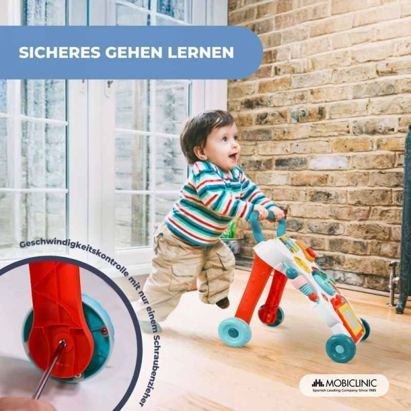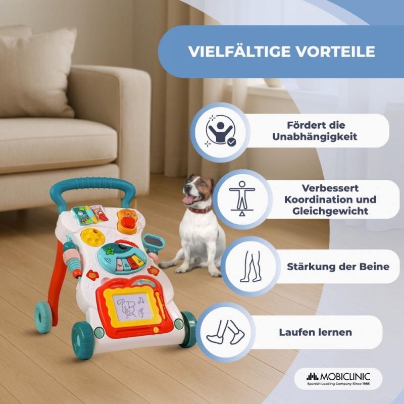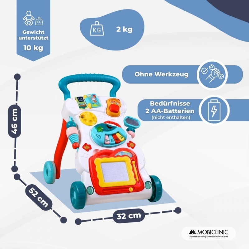 Dieser Lauflernwagen bietet eine doppelte Funktionalität: Er dient als Stützlauflernwagen, sodass das Baby beim Gehen durch den Lenker gestützt wird und so die Stärkung und Koordination der Beine gefördert wird. Und andererseits dient es dank der im Panel enthaltenen Spielzeuge als Spielgerät, das für Unterhaltung und Anregung bei den Kleinen sorgt. Das Panel enthält drei abnehmbare Spielzeuge: ein Zeichenbrett, ein elektrisches Klavier, das Geräusche macht, und ein Spielzeug-Mobile. Außerdem sind sie abnehmbar, sodass Ihr Baby selbstständig damit spielen kann, auch wenn der Lauflernwagen nicht verwendet wird.