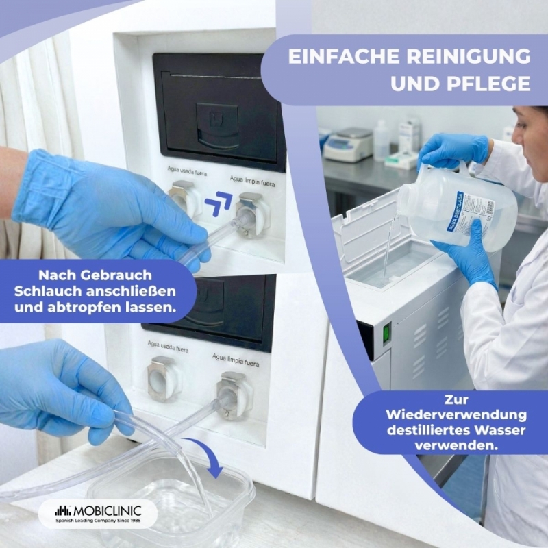 Der 17-Liter-Sterilisationsautoklav Mobiclinic ist für eine vollständige, professionelle und sichere Sterilisation konzipiert und erfüllt die Anforderungen verschiedener Branchen wie Zahnkliniken, medizinische Zentren, Labore, Orthopädiepraxen oder Tierkliniken.