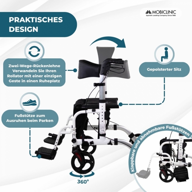 Es verfügt über einen gepolsterten Sitz und eine wendbare Rückenlehne , die nach vorne oder hinten gerichtet werden kann und so während der Pausen bequemen Halt bietet. Die fünffach verstellbaren Fußstützen ermöglichen eine sichere und praktische Beinauflage – stets als Ergänzung zur Entspannung und nicht als Ersatz für einen Rollstuhl.