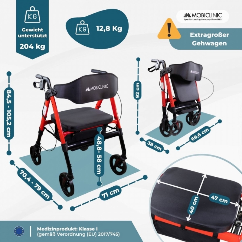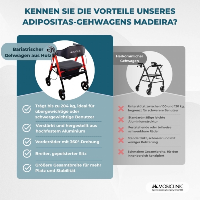 Der bariatrische Gehwagen Madeira Mobiclinic wurde für maximale Stabilität, Robustheit und Komfort entwickelt. Mit einer Tragkraft von bis zu 204 kg übertrifft er Standardmodelle (100–120 kg) bei weitem und ist daher ideal für übergewichtige Benutzer oder Personen, die sich mehr Sicherheit bei der Fortbewegung wünschen.