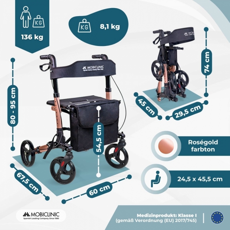 Faltbarer Rollator | Aluminium | Bis 136 kg | Handbremsen | Sitz und Rückenlehne | Roségold | Trajano | Deluxe | Mobiclinic