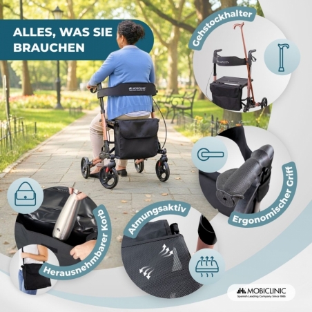 Dieser vierrädrige Rollator bietet dank seines Sitzes mit Rückenlehne maximalen Komfort und ist ideal zum Ausruhen. Er verfügt außerdem über eine Aufbewahrungstasche für Einkäufe oder andere persönliche Gegenstände sowie einen Gepäckträger für zusätzlichen Komfort auf Reisen.