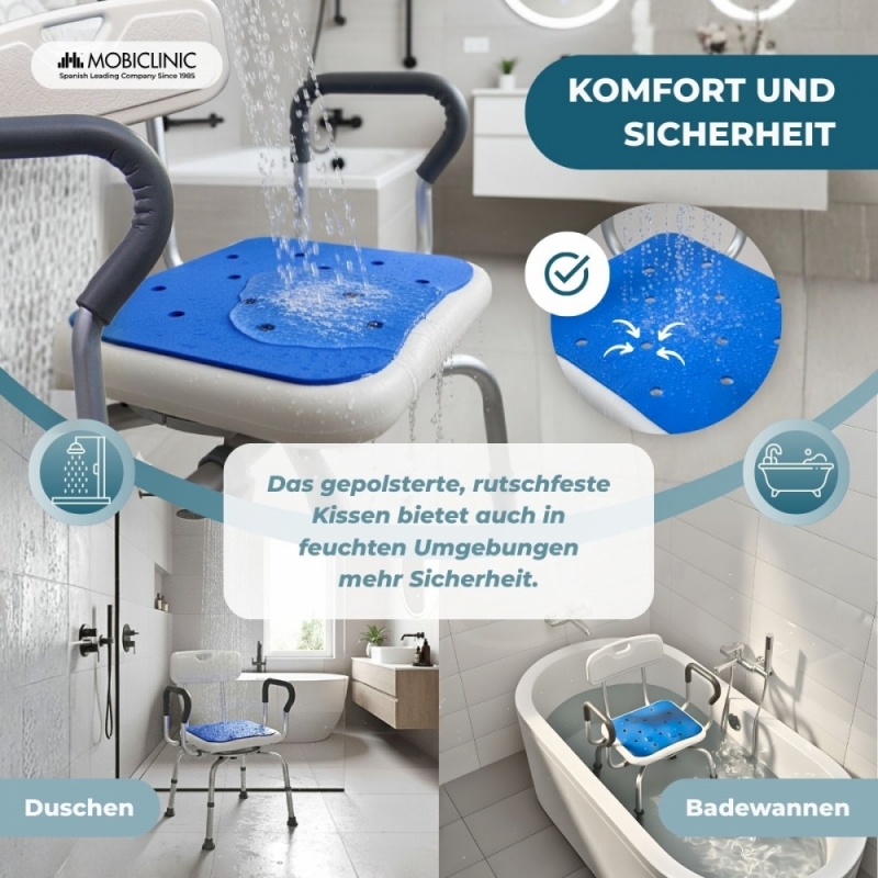 KOMFORT UND ZUSÄTZLICHE UNTERSTÜTZUNG: Dieser Badestuhl verfügt über ergonomische Armlehnen, die beim Aufstehen und Hinsetzen optimalen Halt bieten und so für mehr Sicherheit sorgen und Verspannungen vorbeugen. Sitzfläche und Rückenlehne sind mit einer rutschfesten EVA-Polsterung ausgestattet, die auch in feuchter Umgebung für bequemen und weichen Halt sorgt.
