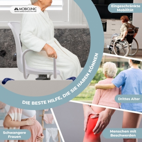 Es verfügt über einen ergonomischen, drehbaren Sitz, der die Hygiene erleichtert und die Pflege vereinfacht. Es ist das perfekte Möbelstück für Menschen, die aufgrund von Durchblutungsstörungen, Gelenkschwäche oder vorübergehenden Verletzungen nicht lange stehen können.
