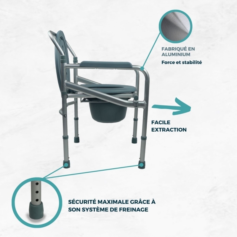 - La chaise de toilette comprend également des accoudoirs confortables et un siège de toilette avec couvercle.