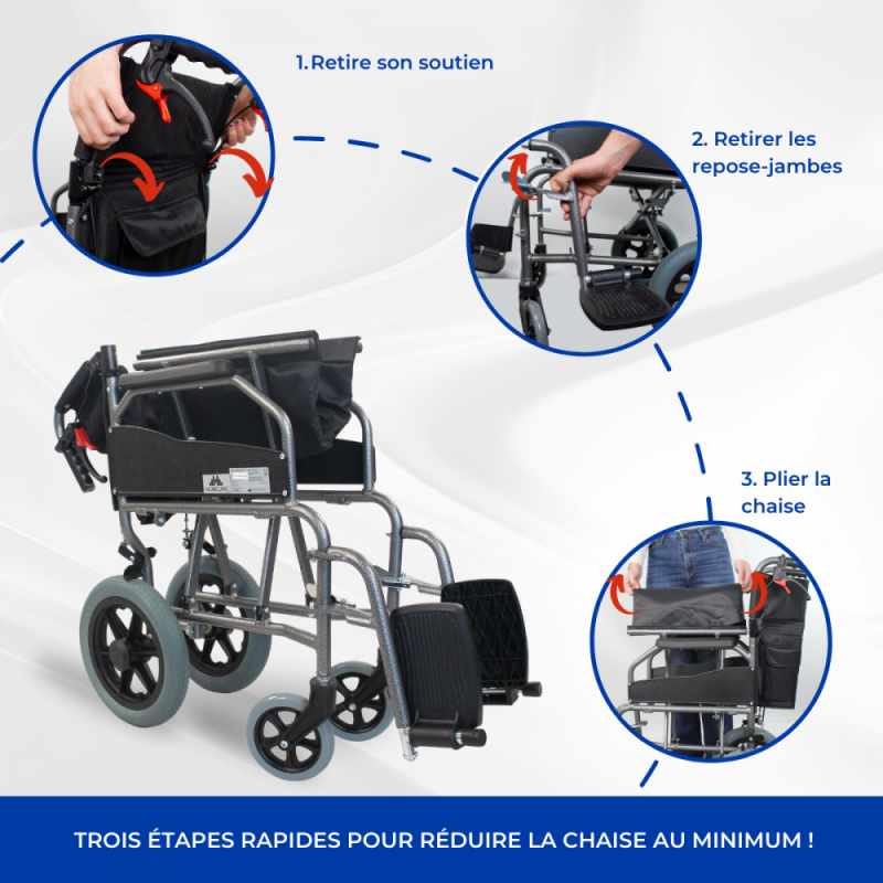 La particularité de ce fauteuil roulant manuel réside dans son système de pliage, qui vous permet de passer par des endroits étroits avant de le réouvrir. Le dossier est également pliable, ce qui vous donne la possibilité de le ranger partout.