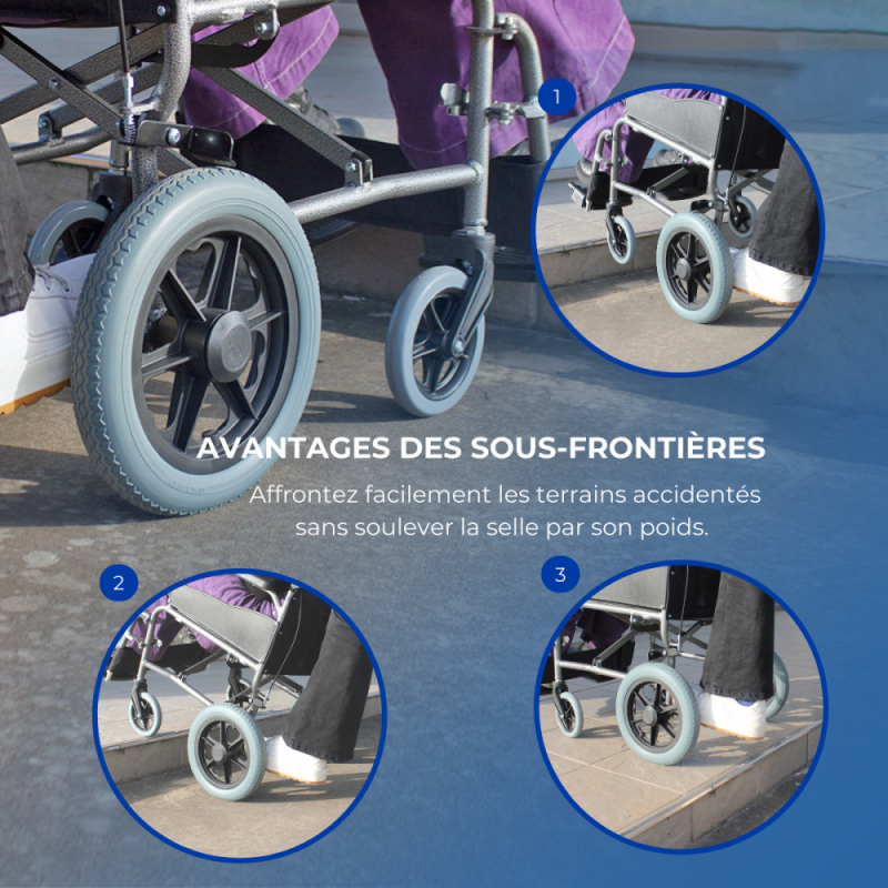 Chaise très pratique, facilement pliable et légère .Manque de confort en raison des pneus pleins. J'y ai remédié en remplaçant ceux des grandes roues par des pneus gonflables.