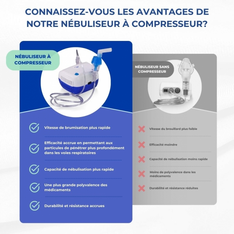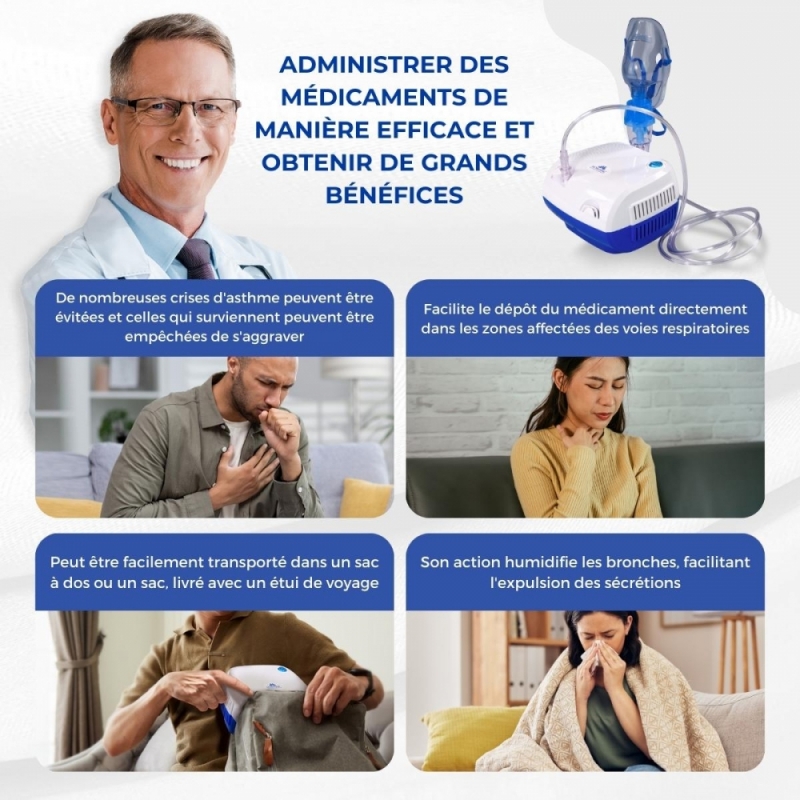 Le nébuliseur est un appareil électrique qui convertit les médicaments liquides en une brume douce qui est inhalée et délivrée directement aux poumons par l'air comprimé.