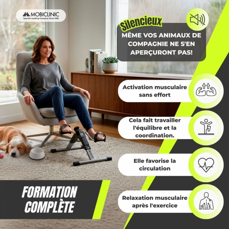 RÉSISTANCE RÉGLABLE SANS ÉLECTRICITÉ : Permet un réglage manuel de l'intensité du pédalage grâce à une molette centrale, s'adaptant aux besoins de chaque utilisateur sans avoir besoin de prises ni de câbles.