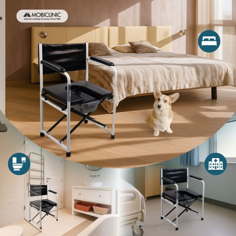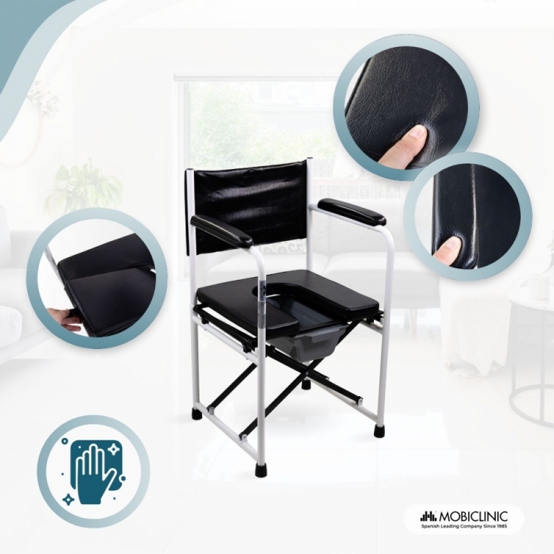 La chaise toilettes a des accoudoirs rembourrés confortables. Sa taille et sa le fait qu’elle peut être pliée la rendent adaptée à tout type d'endroits.