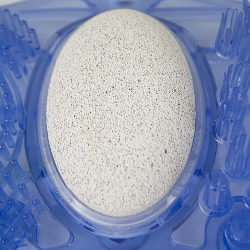 Ce lave pieds est parfait pour se laver les pieds sans avoir à se pencher, avec deux types de poils, certains plus durs et d'autres plus doux et plus mous, qui peuvent être intercalés au besoin. Au centre se trouve un morceau de pierre ponce pour exfolier en douceur et adoucir les pieds.