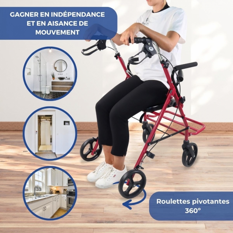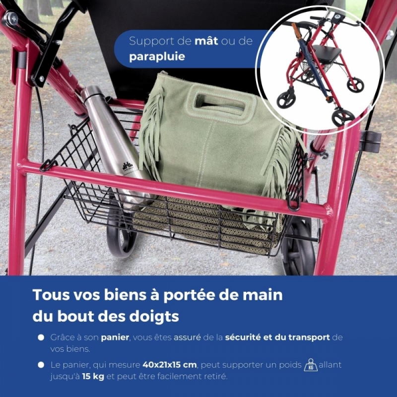- Son utilité : non seulement comme déambulateur, mais aussi comme siège ou canne, ce qui en fait un déambulateur très pratique. Il dispose également d'un panier pour transporter vos affaires.