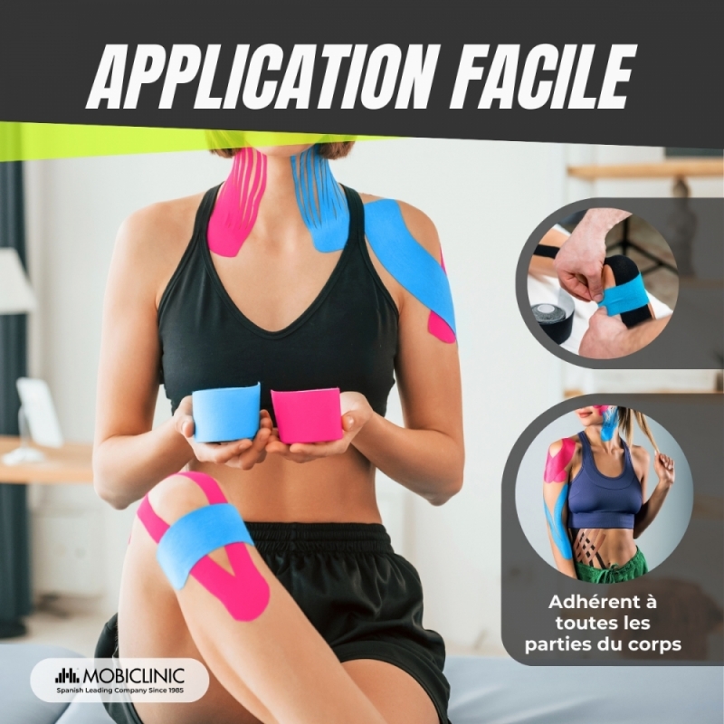 Blessures comme foulures de cheville, œdèmes, épicondylite ou tension plantaire peuvent se soulager rapidement avec ses bandages kinésiologiques qui améliorent le muscle débilité.