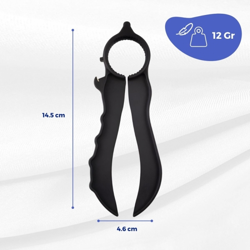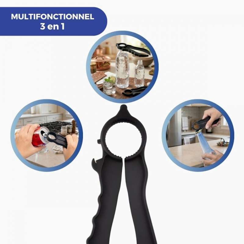 Ouvre-bouteille multi-usage noir en plastique. Sa forme lui permet d'ouvrir les canettes de boissons gazeuses, les bouchons à vis et autres récipients. Sa simplicité d'utilisation en fait l'accessoire de cuisine idéal pour les personnes ayant des problèmes dans les articulations supérieures.