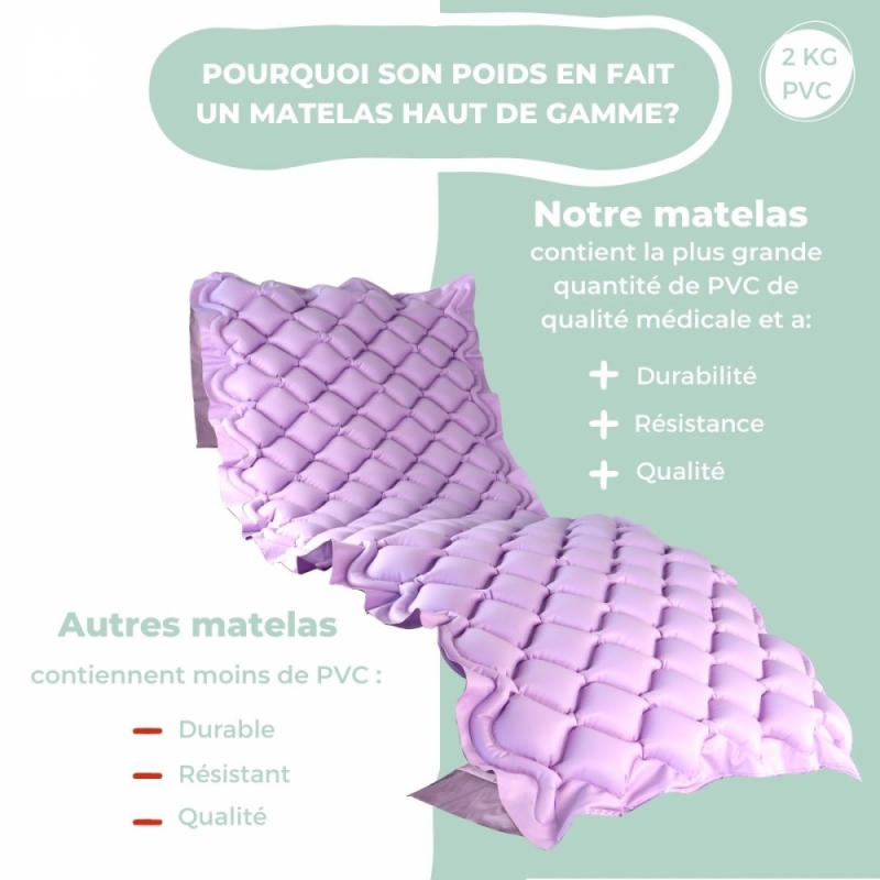 Ce matelas gonflable anti-escarres possède des alvéoles alternées et un réglage en fonction du poids du patient, répartissant la pression exercée par le corps sur la structure.