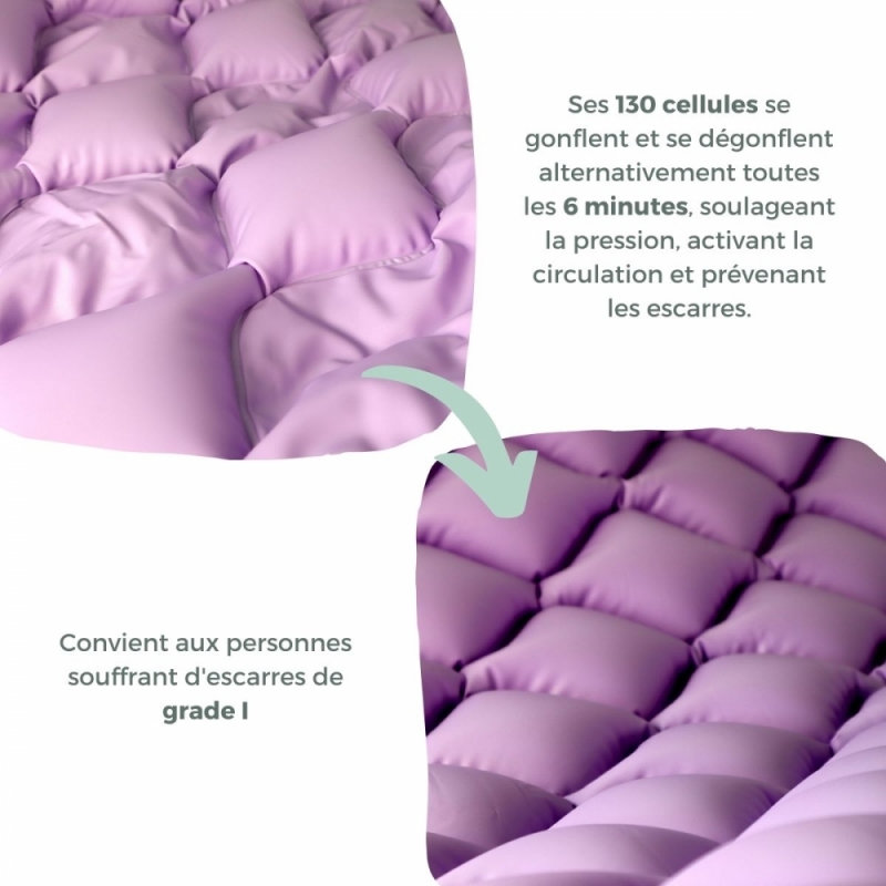 Ses 130 cellules individuelles se gonflent et se dégonflent alternativement pendant des périodes de 6 minutes et de cette façon, le patient recevra un soulagement constant de la pression . Cette pression, répartie sur la structure par alternance de cellules, active la circulation et prévient la formation d'escarres.