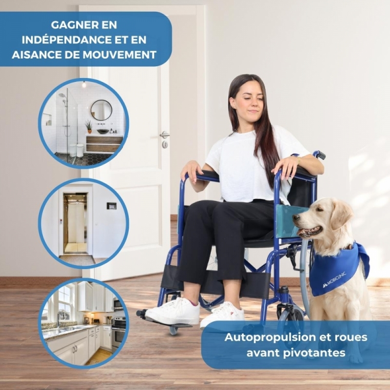 C'est un fauteuil de transfert qui a une grande autonomie avec des roues qui réduisent l'effort et des freins manuels qui empêchent un éventuel basculement.