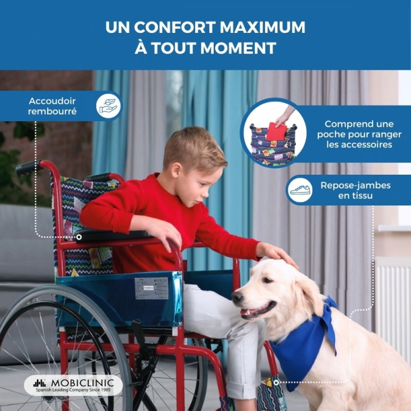 Le fauteuil roulant modèle Teatro se distingue dès le premier coup d'œil par son design. Ce fauteuil roulant manuel et autopropulsé est idéal pour les enfants grâce à son allure jeune, grâce à son dossier fixe coloré et à motifs.