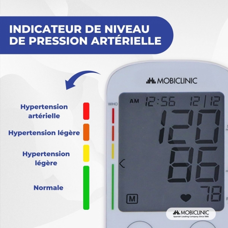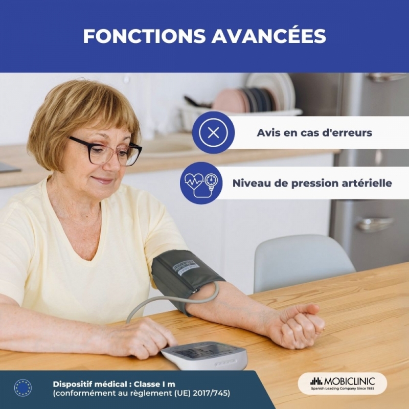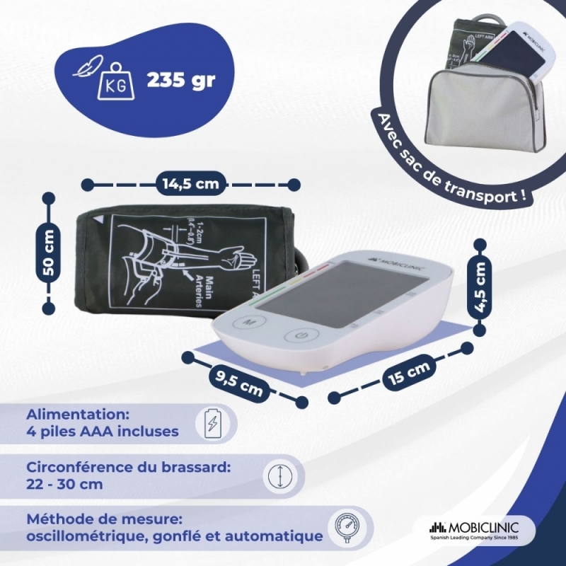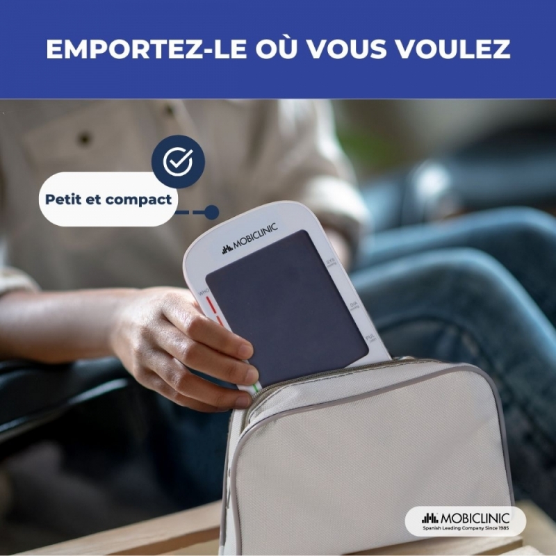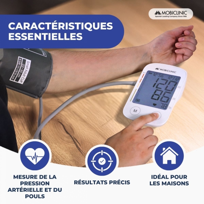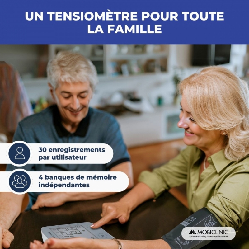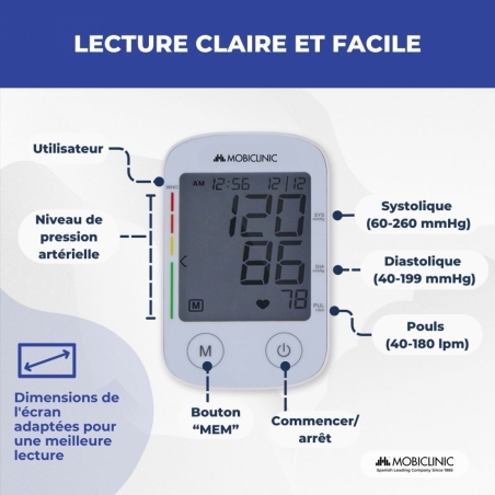 Le tensiomètre automatique avec mémoire Mobiclinic mesure la tension artérielle et le pouls rapidement et facilement.