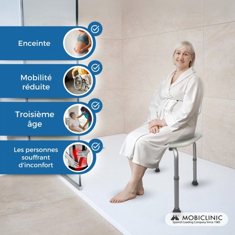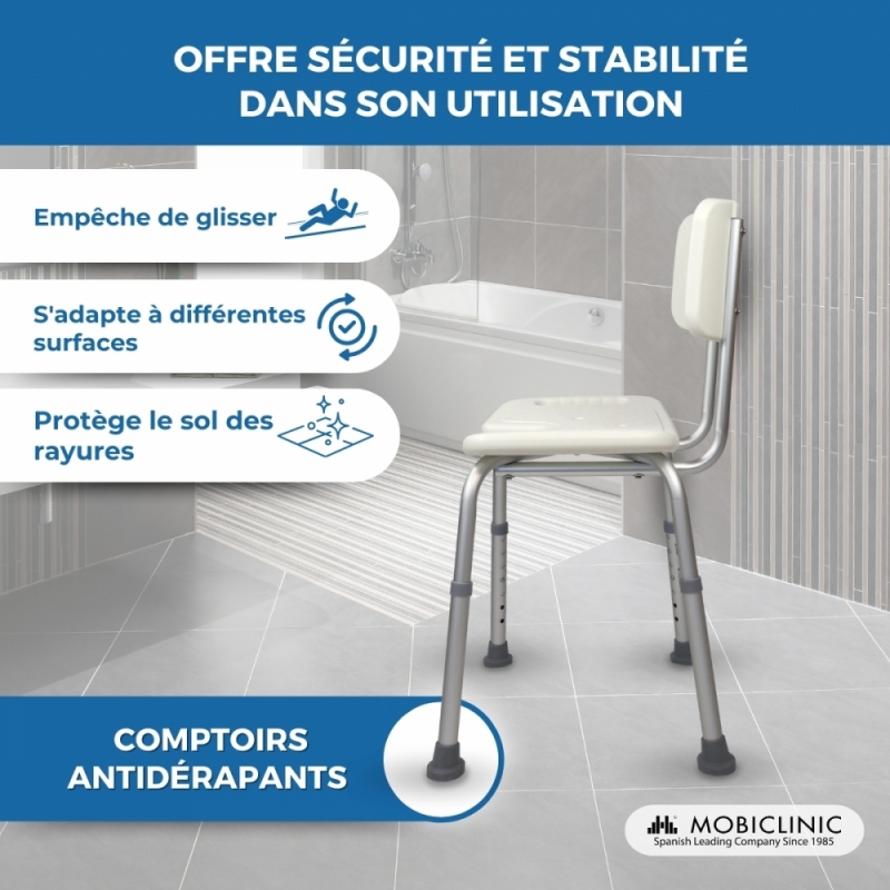 Il est idéal pour une utilisation dans votre douche, votre baignoire ou toute autre salle de bains. La conception de ses pieds et les embouts en caoutchouc antidérapants lui permettent de s'adapter parfaitement à la surface de support, garantissant ainsi la stabilité pendant l'utilisation.