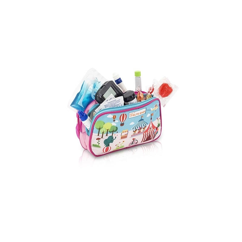Un étui isotherme conçue pour que les plus jeunes membres de la famille puissent emporter tous les éléments essentiels au traitement du diabète. La structure de l'étui thermique à insuline est divisée en deux poches, ce qui permet de ranger et de différencier facilement aussi bien les instruments de mesure (glucomètre, bandelettes réactives, lancettes) que les stylos à insuline pré-remplis, dûment logés dans la section isotherme. La étui isotherme comporte une poche frontale conçue pour le transport du matériel de diagnostic du diabète : glucomètre, lancettes, bandelettes de test, etc. En revanche, la poche arrière de l'étui thermique est conçue pour contenir à la fois le gel froid et les applicateurs d'insuline, elle dispose d'une poche plate interne pour contenir le gel. Matériau isotherme blanc