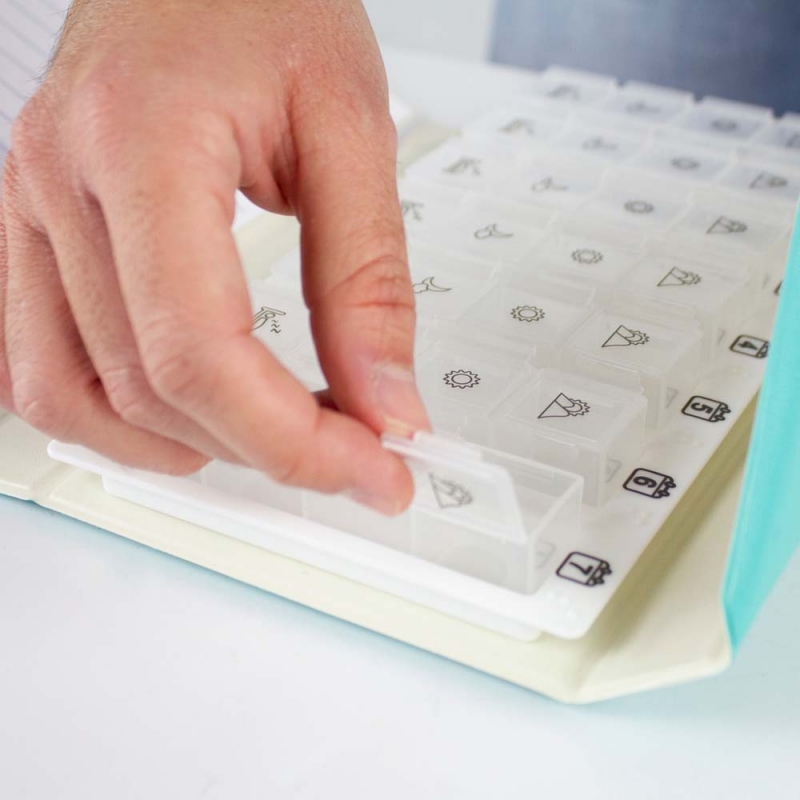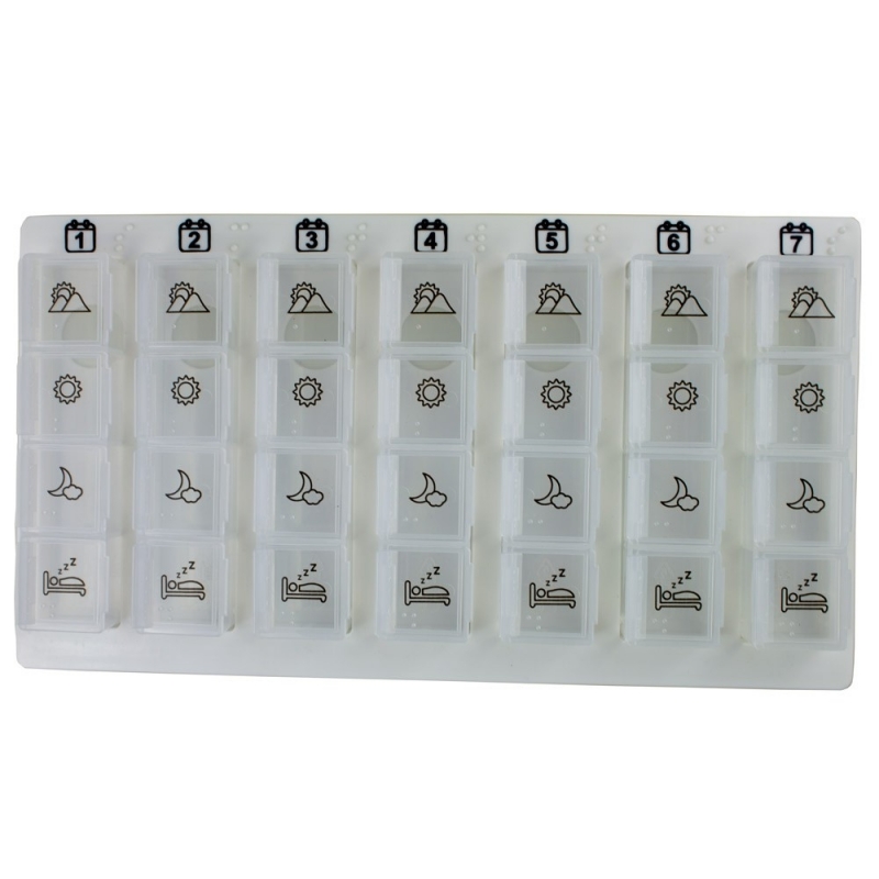 Chaque conteneur a quatre divisions avec l'icône de chaque moment de la journée, également représentée en braille. Ils correspondent au petit déjeuner, au déjeuner, au dîner et au coucher mais peuvent être adaptés aux besoins de chaque patient. Chacun des sept conteneurs de ce pilulier pour personnes âgées peut être facilement transporté individuellement pour ne transporter qu'une seule pilule par jour.