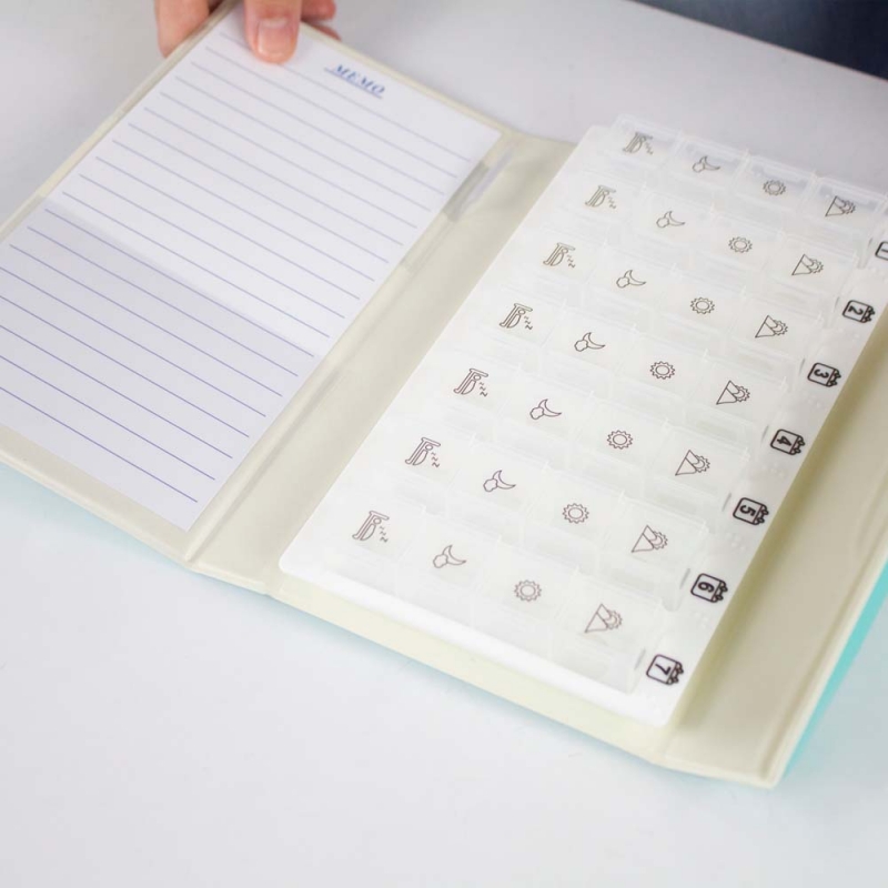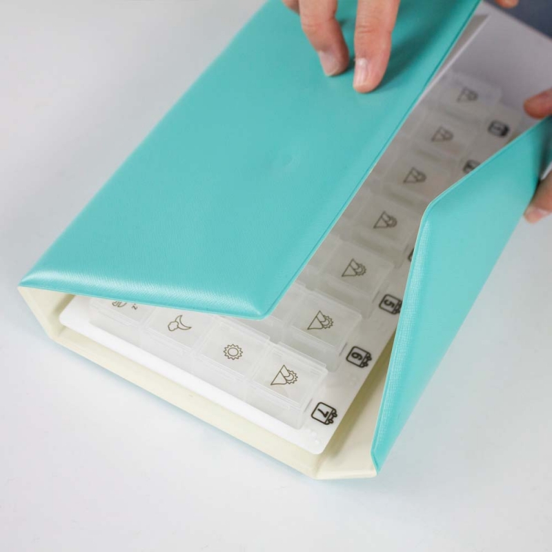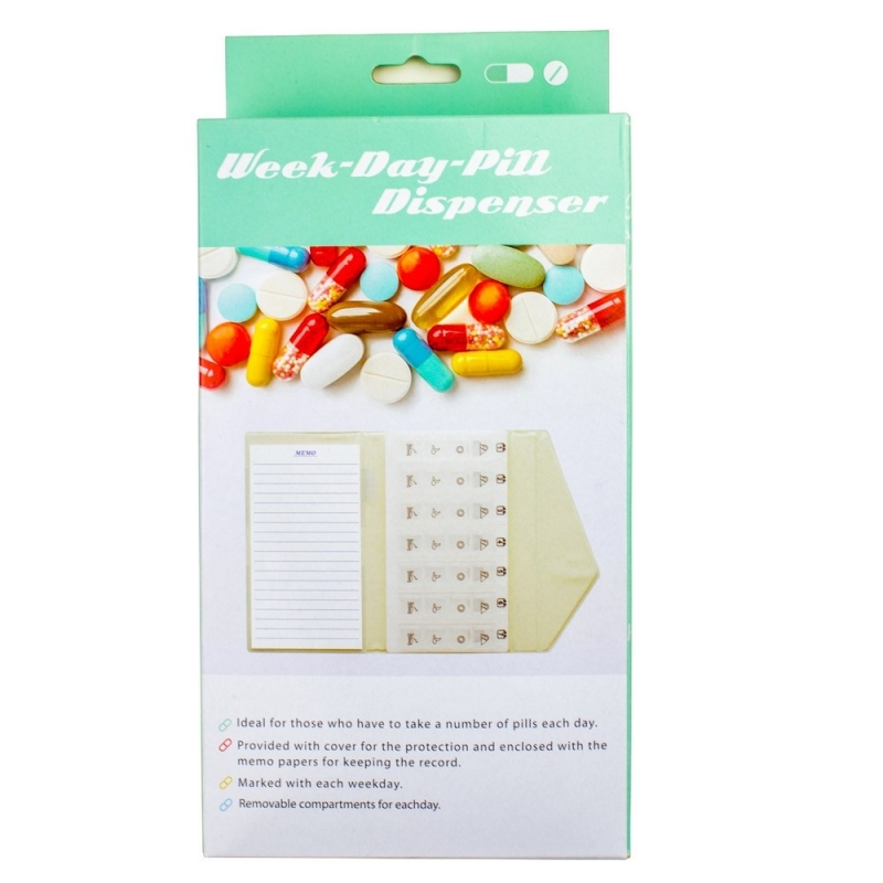 Ce pilulier dispose d'un bloc-notes de 8 pages et d'un espace pour les stylos et les cartes, afin que la carte de santé puisse être stockée confortablement et en toute sécurité. Le bloc-notes peut être utilisé pour garder la trace des tablettes à chaque prise de vue.