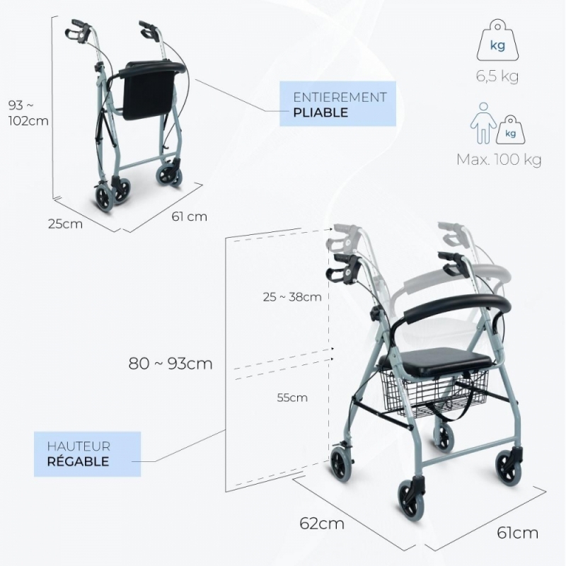 - Comprend un panier, idéal pour ranger vos effets personnels en toute sécurité lorsque vous marchez. Vous pouvez le placer à la fois sous le siège et à l'avant du déambulateur.