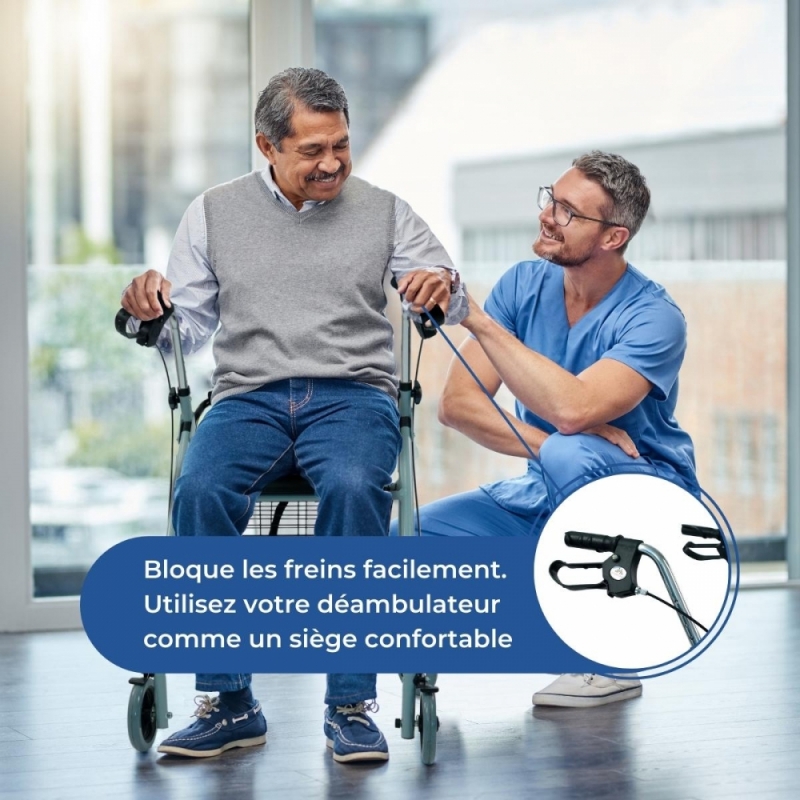 - Poignées ergonomiques réduisant la fatigue pendant l'utilisation. Elles comprennent des freins pour arrêter en douceur le déambulateur au bon moment et sans effort. Vous avez également la possibilité de laisser les freins verrouillés pour assurer l'immobilisation du déambulateur à roulettes lorsque vous vous reposez sur le siège.