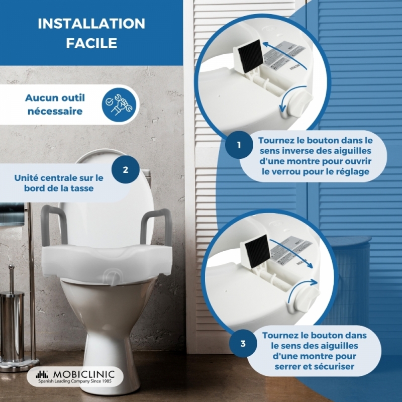 - Sa sûreté : le mécanisme de serrage assure un verrouillage sûr et facile sur les toilettes.