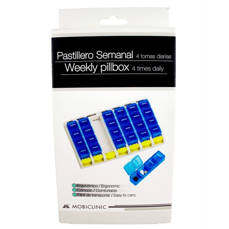 Ce pilulier est parfait pour organiser et distribuer les traitements médicaux de toute la semaine. Il est muni de 4 compartiments quotidiens et de 7 compartiments pour la semaine dans lesquels vous pourrez ordonner vos pilules du matin, du midi, de l'après-midi, puis du soir. De tels compartiments sont annotés des jours de la semaine pour vous permettre de ne jamais vous tromper.