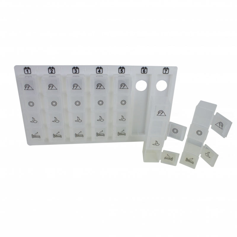Chaque conteneur a quatre divisions avec l'icône de chaque moment de la journée, également représentée en braille. Ils correspondent au petit déjeuner, au déjeuner, au dîner et au coucher mais peuvent être adaptés aux besoins de chaque patient. Chacun des sept récipients peuvent être facilement transportés sous forme de pilulier individuel pour ne transporter qu'un seul comprimé par jour.