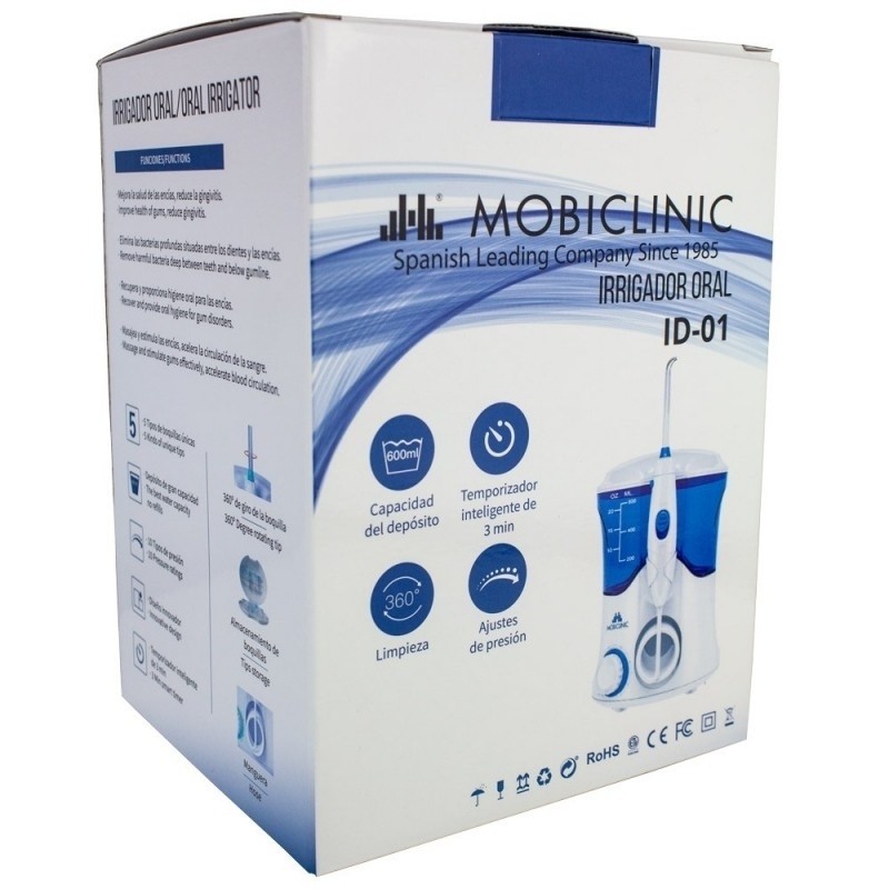 - Accessoires : 7 canules (tête parodontale, tête haute pression, tête de nettoyage de la langue, tête de plaque dentaire, tête orthodontique), réservoir et unité d'aspiration.