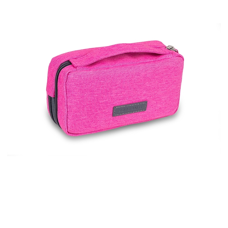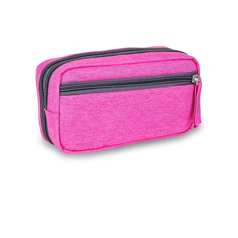 Trousse isotherme pour diabétique avec un design exclusif, moderne et élégant, en tissu rose de haute qualité, qui permet de transporter de manière optimale tous les accessoires nécessaires. Cette sacoche pour diabétique se compose de plusieurs compartiments tels qu'une poche filet, une poche velcro, un élastique pour les stylos, un élastique pour le lecteur de glucose, et une poche isotherme pour préserver le froid.