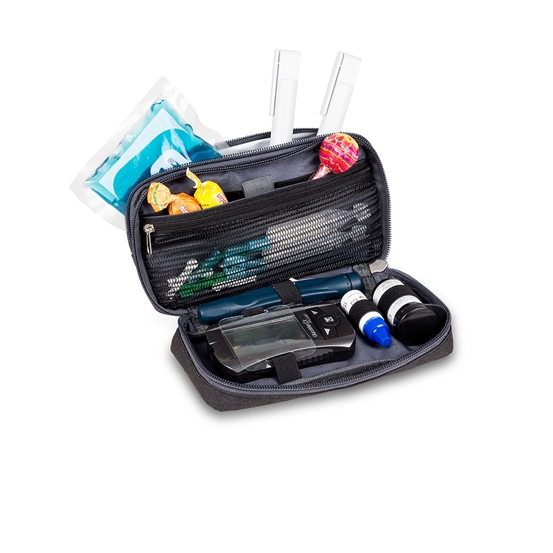 Trousse isotherme pour diabétique avec un design exclusif, moderne et élégant, en tissu noir de haute qualité, qui permet de transporter de manière optimale tous les accessoires nécessaires. Cette sacoche pour diabétique se compose de plusieurs compartiments tels qu'une poche filet, une poche velcro, un élastique pour les stylos, un élastique pour le lecteur de glucose, et une poche isotherme pour préserver le froid.