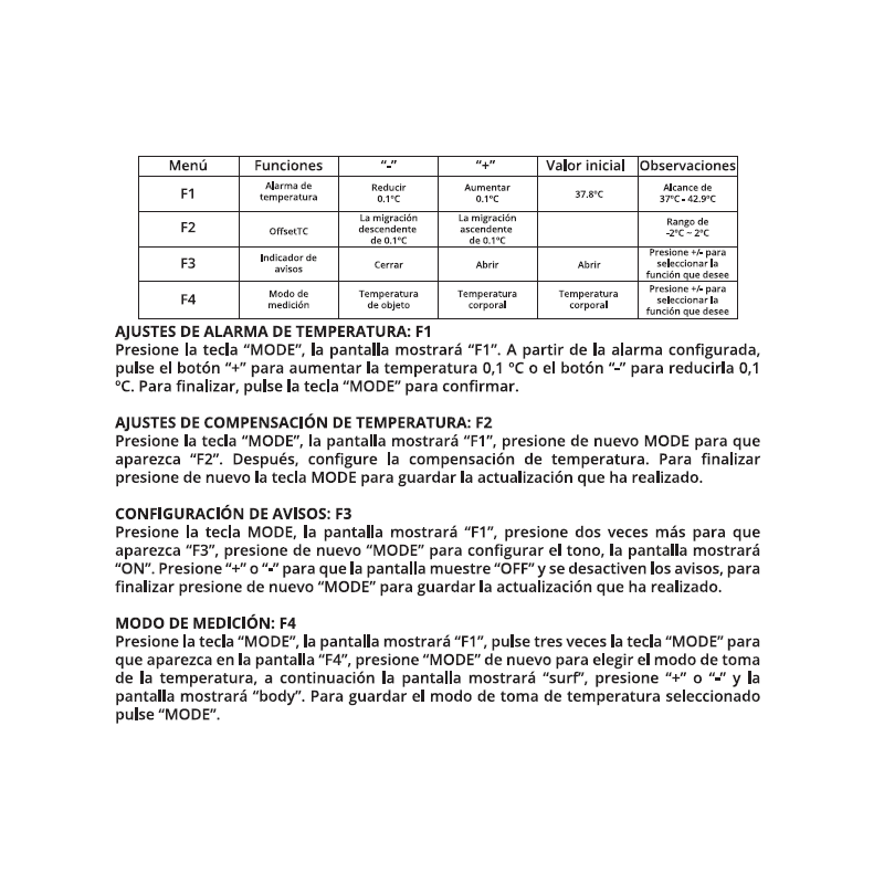 Il a la capacité d'enregistrer des températures corporelles entre 32º et 42,9º et dispose également d'une fonction d'alarme qui alerte en cas de fièvre si la température du patient est égale ou supérieure à 38º.