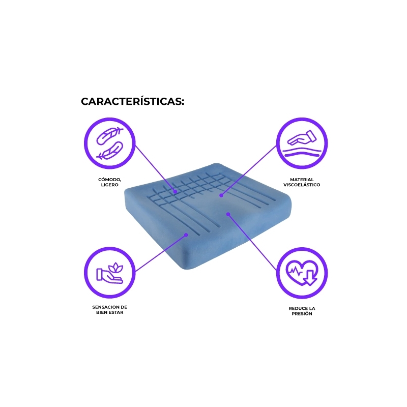 Coussin ergonomique en mousse viscoélastique à effet de mémoire et forme ergonomique. Réduisez les pressions dans les zones les plus exposées: sacrum et ischium. La forme est dimensionnée par rapport à l'ischion. On a même envisagé l'adoption fréquente d'une posture incorrecte, que ce coussin empêche en bloquant l'ischion lorsqu'il avance.