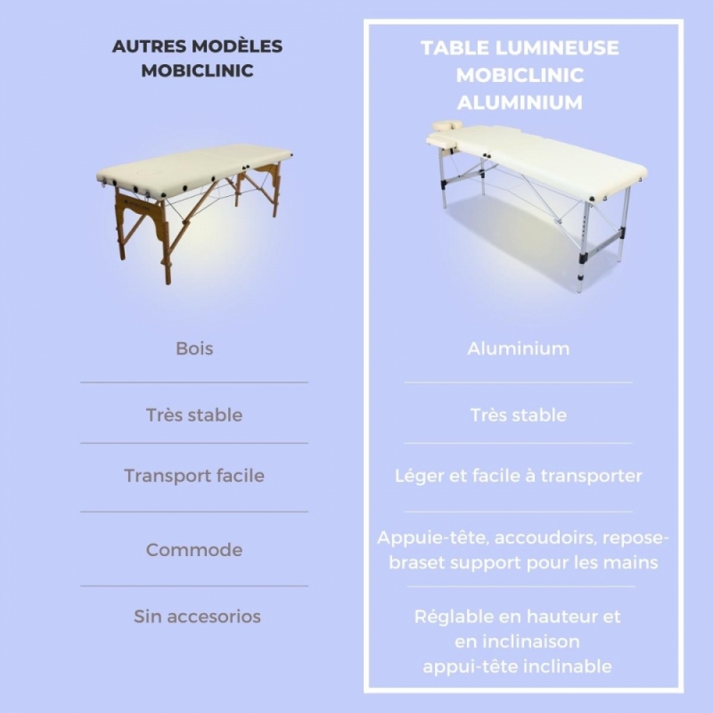 Table de massage pliante | Kinesithérapie | Portable | 186x60 cm | Aluminium | Revêtement similicuir | Light | Mobiclinic