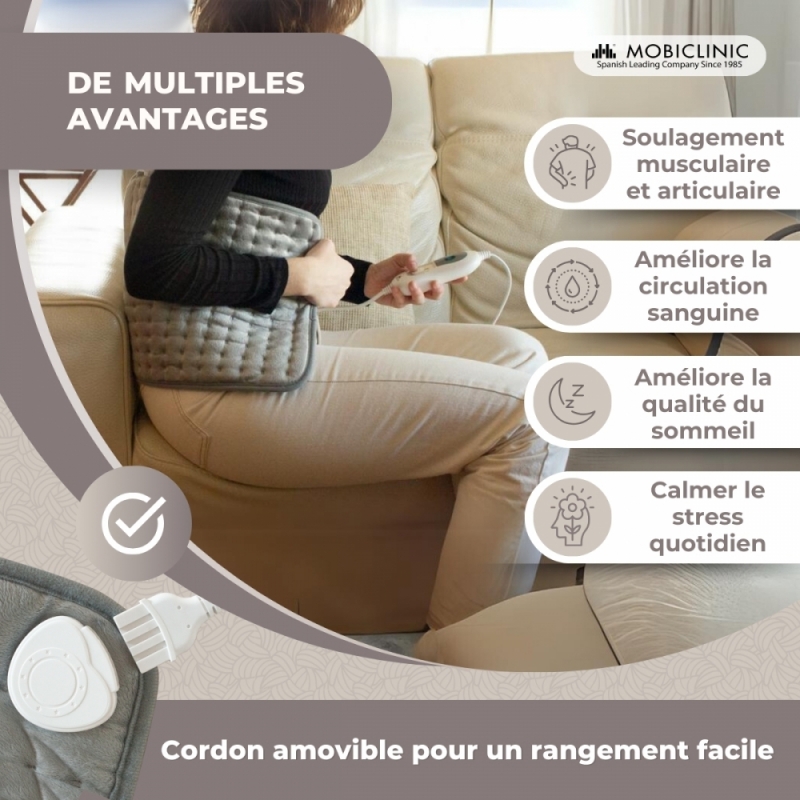 Cette chaleur douce dilate les vaisseaux sanguins et facilite la circulation, soulageant ainsi la douleur. Il contribue également à la récupération de la mobilité musculaire et articulaire, car il détend les muscles et réduit l'inconfort.
