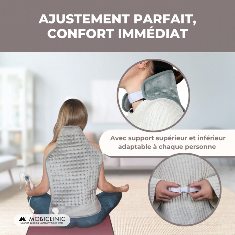 ADAPTABLE : Le coussin dorsal et cervical s'adapte à votre anatomie grâce à sa fermeture velcro au niveau du cou et à un élastique réglable à la taille. Le coussin chauffant couvre tout le dos et distribue la chaleur uniformément du cou à la taille