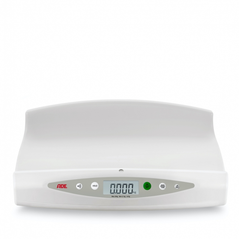 Plateau de pesée pour bébé conçu avec un contour lisse et une surface sûre pour les tout-petits et même les bébés assis. Une graduation précise de 5 g sur toute la plage de pesée de 20 kg, ainsi que la fonction de rétention automatique et un système d'amortissement électronique garantissent des résultats de pesée précis et rapides.